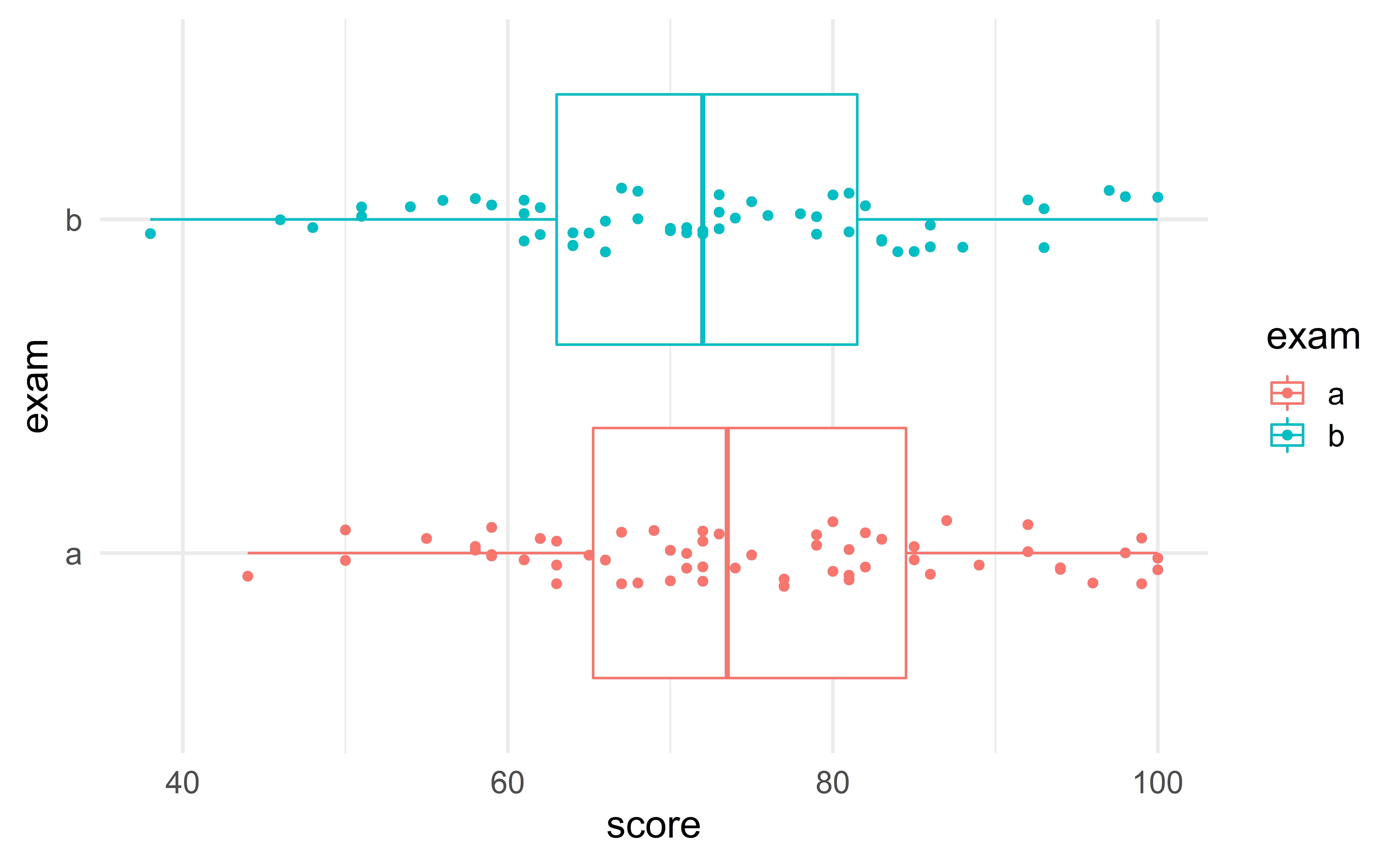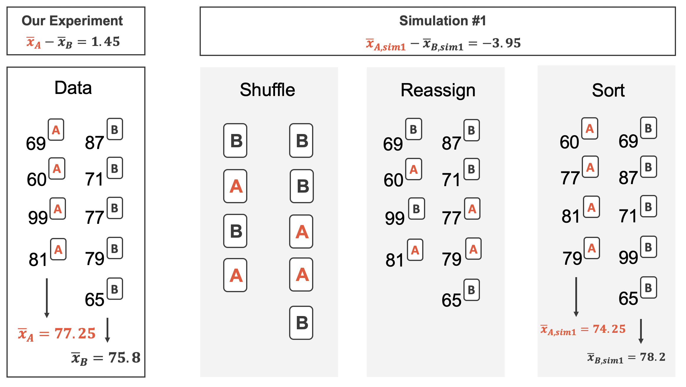 \(\Rightarrow\) randomly re-assign the scores independently of the exam type.