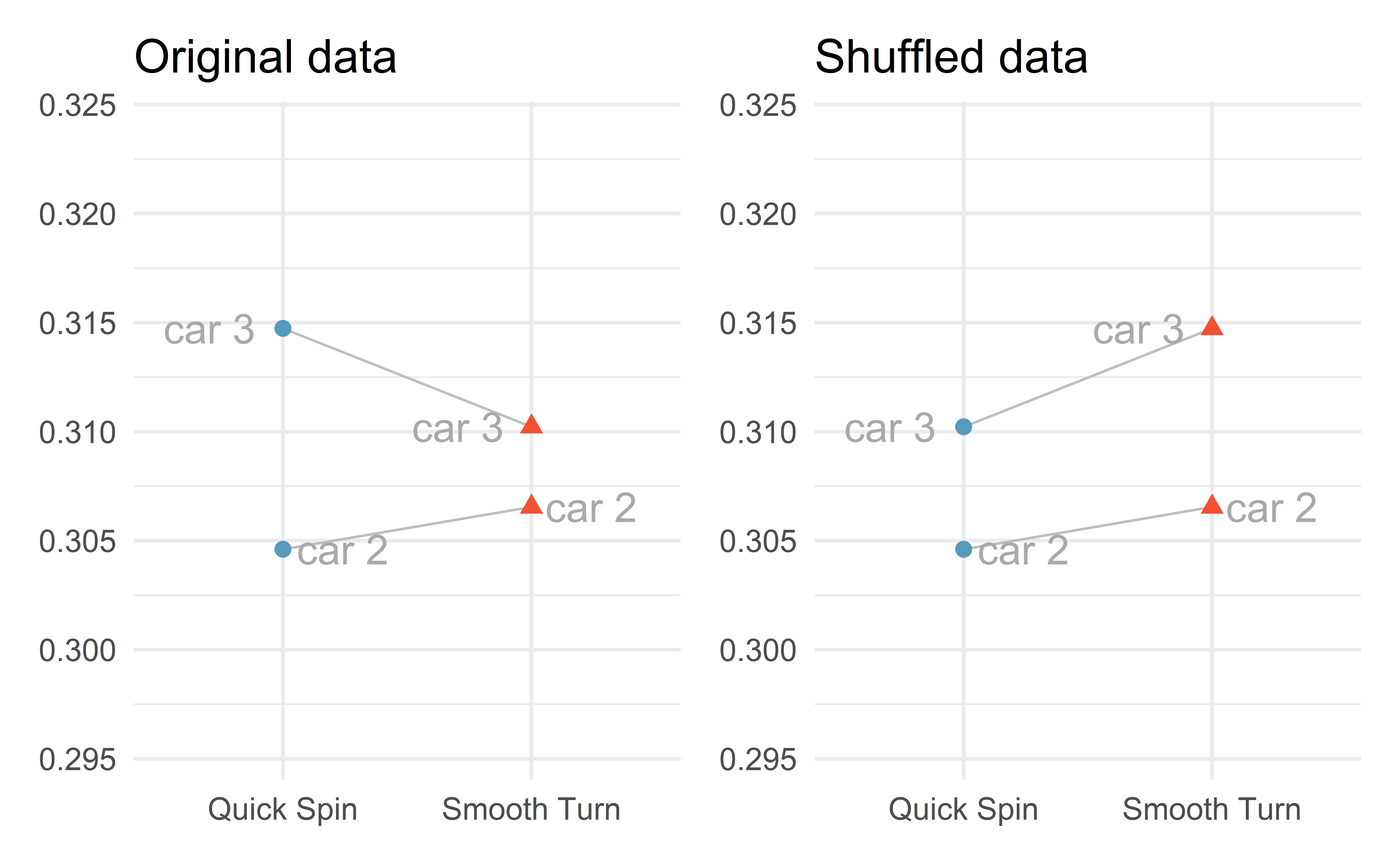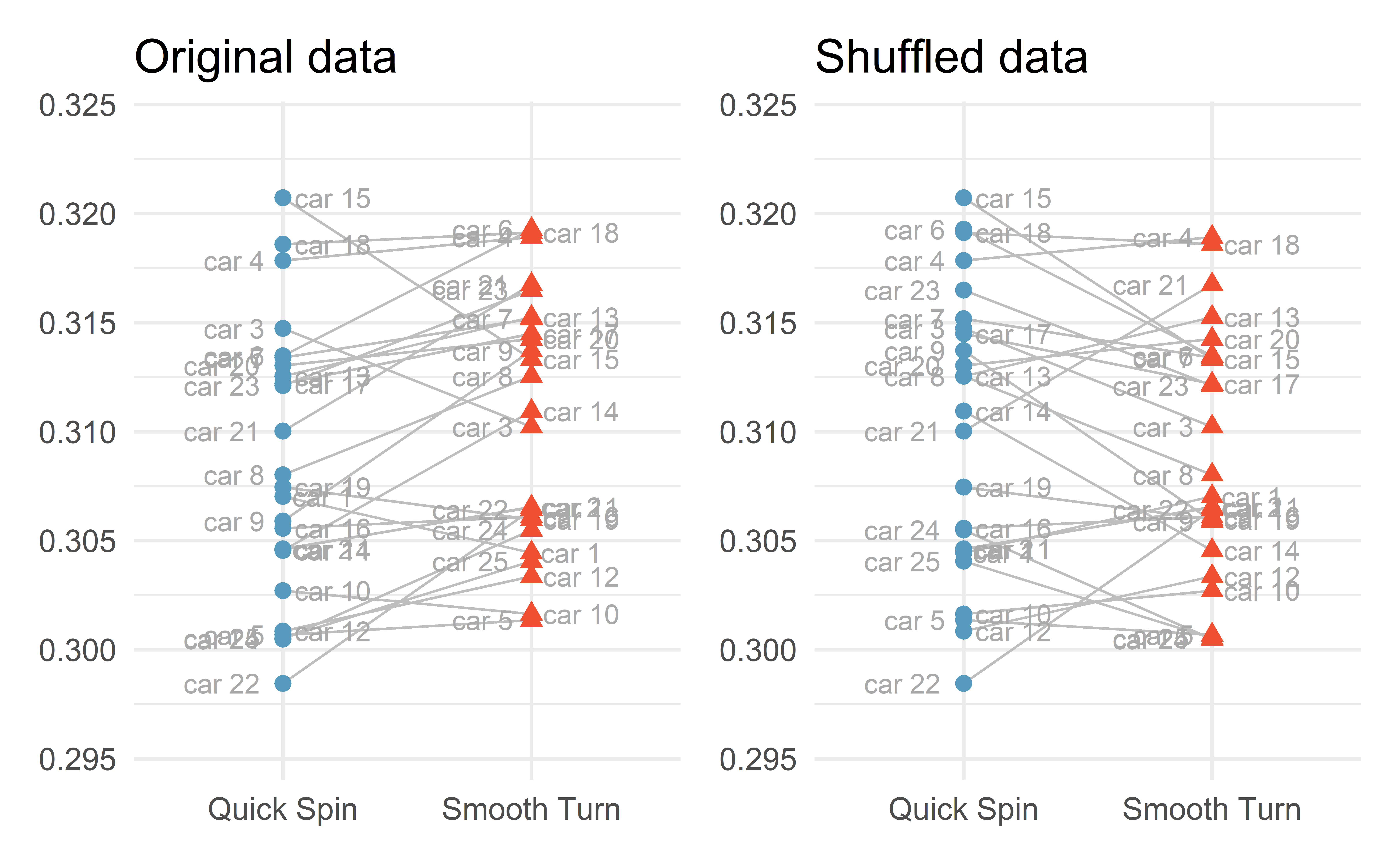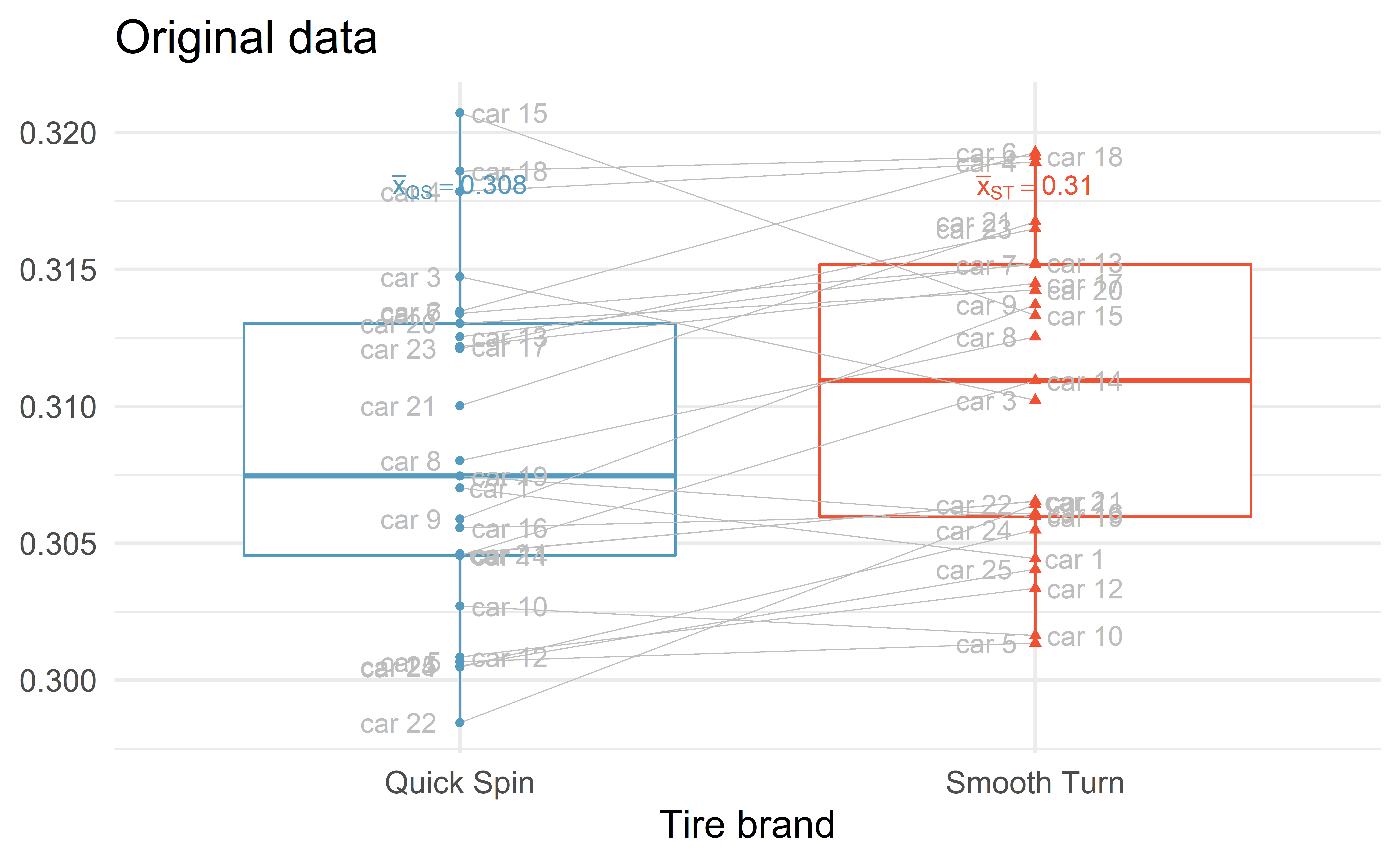 \(\Rightarrow\) randomly re-assign tire tread independently of tire brand.