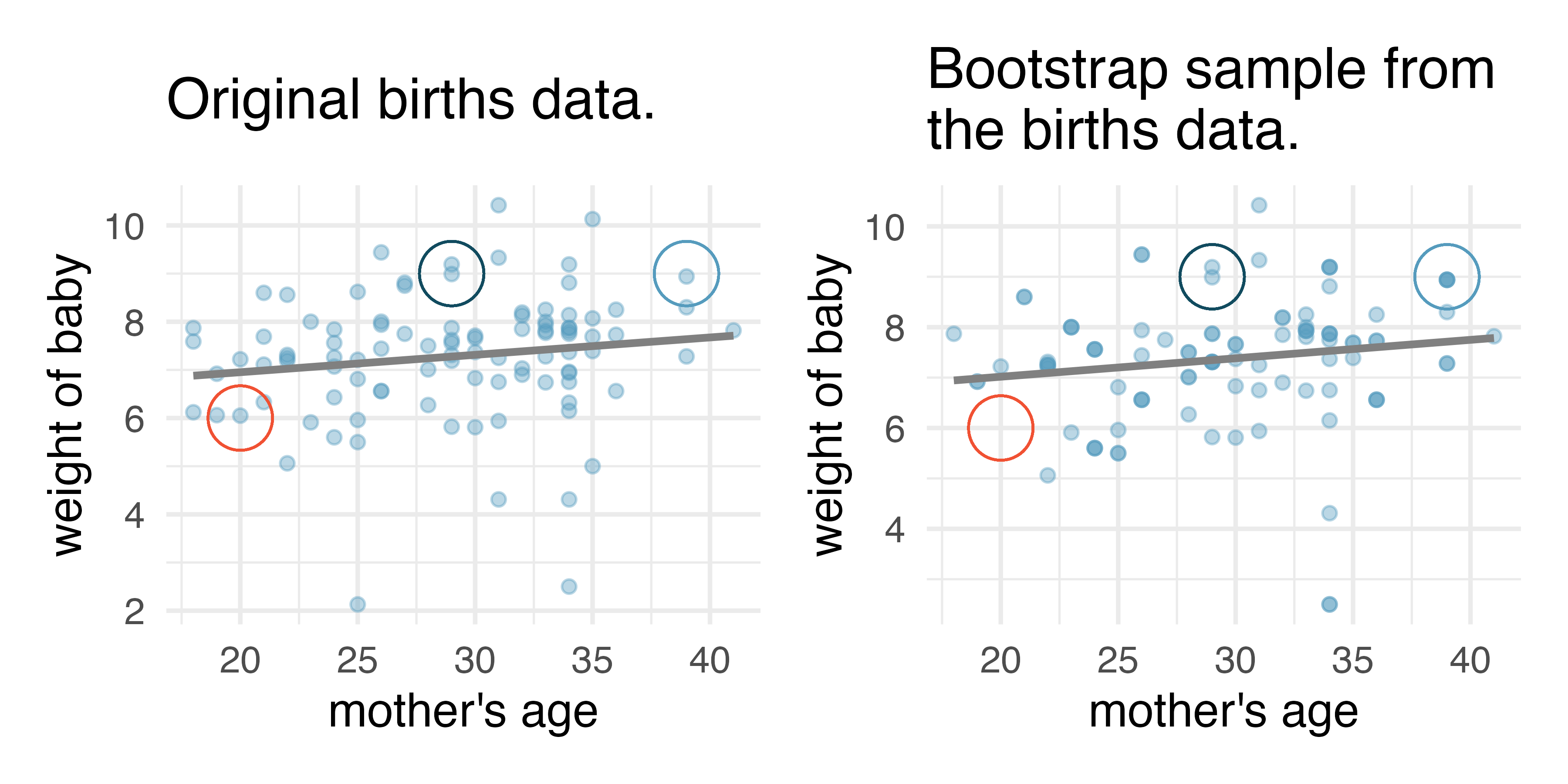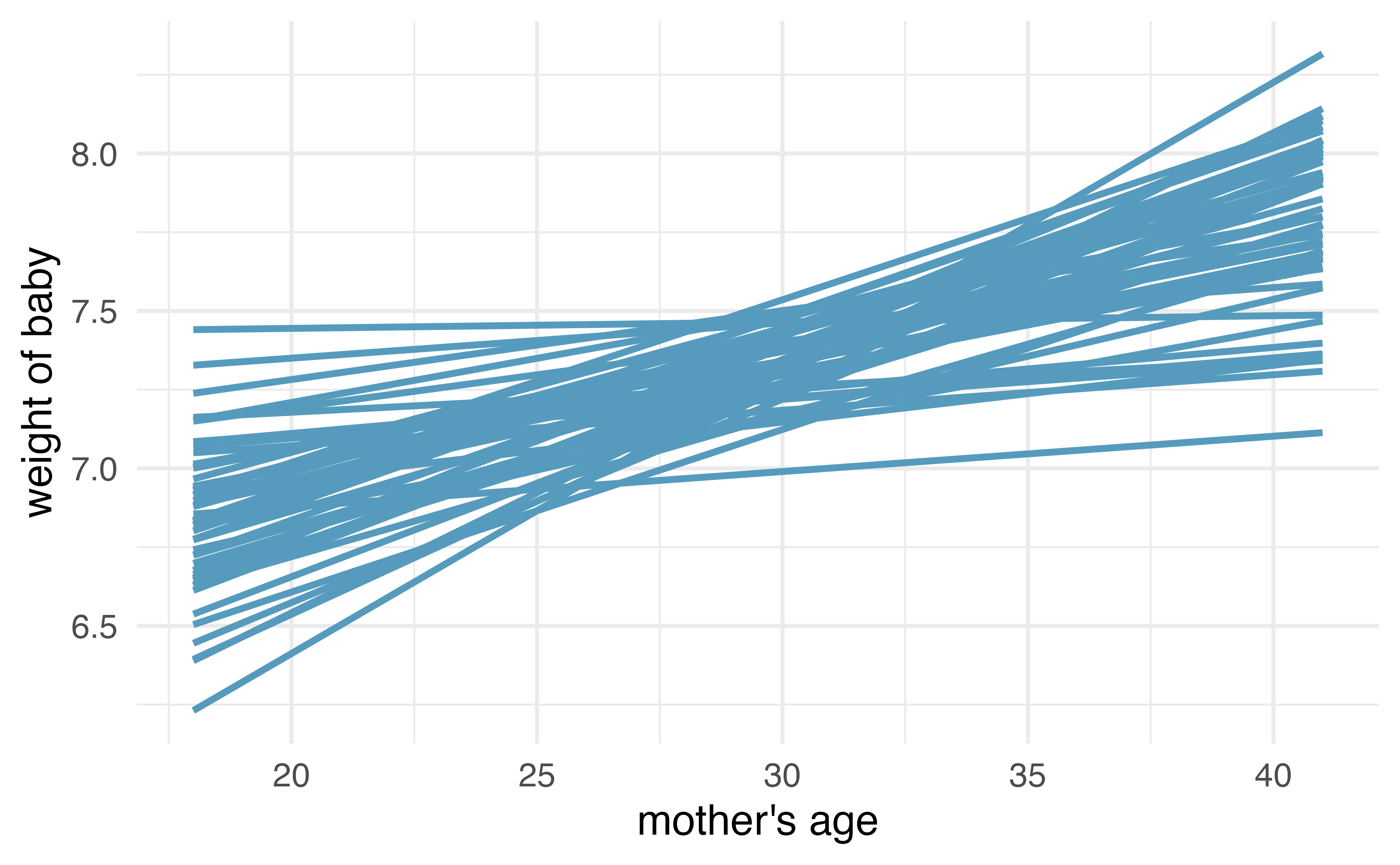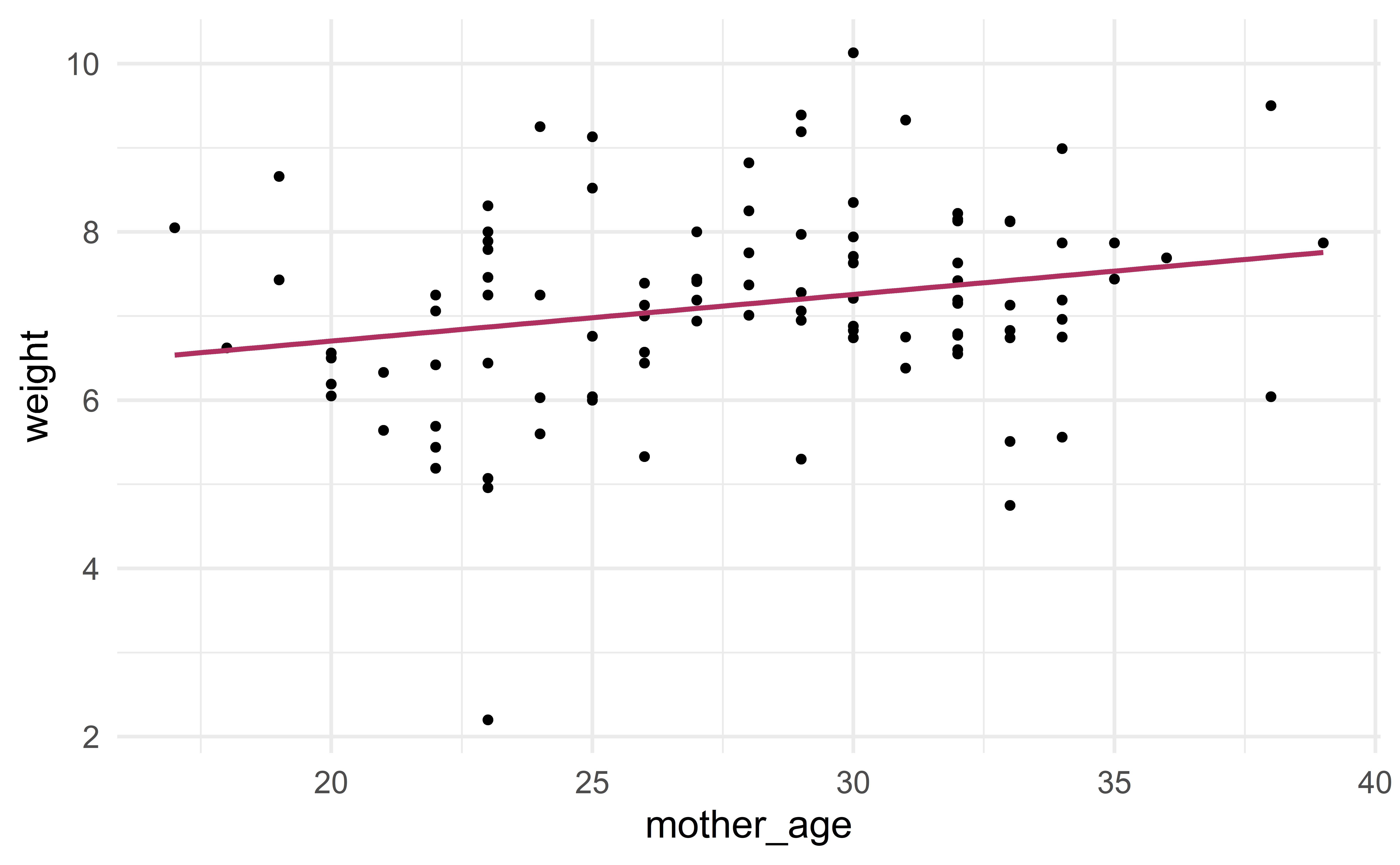 select(weight, mage) %>% # only keep the variables weight (newborn's weight) and mage (mother's age)