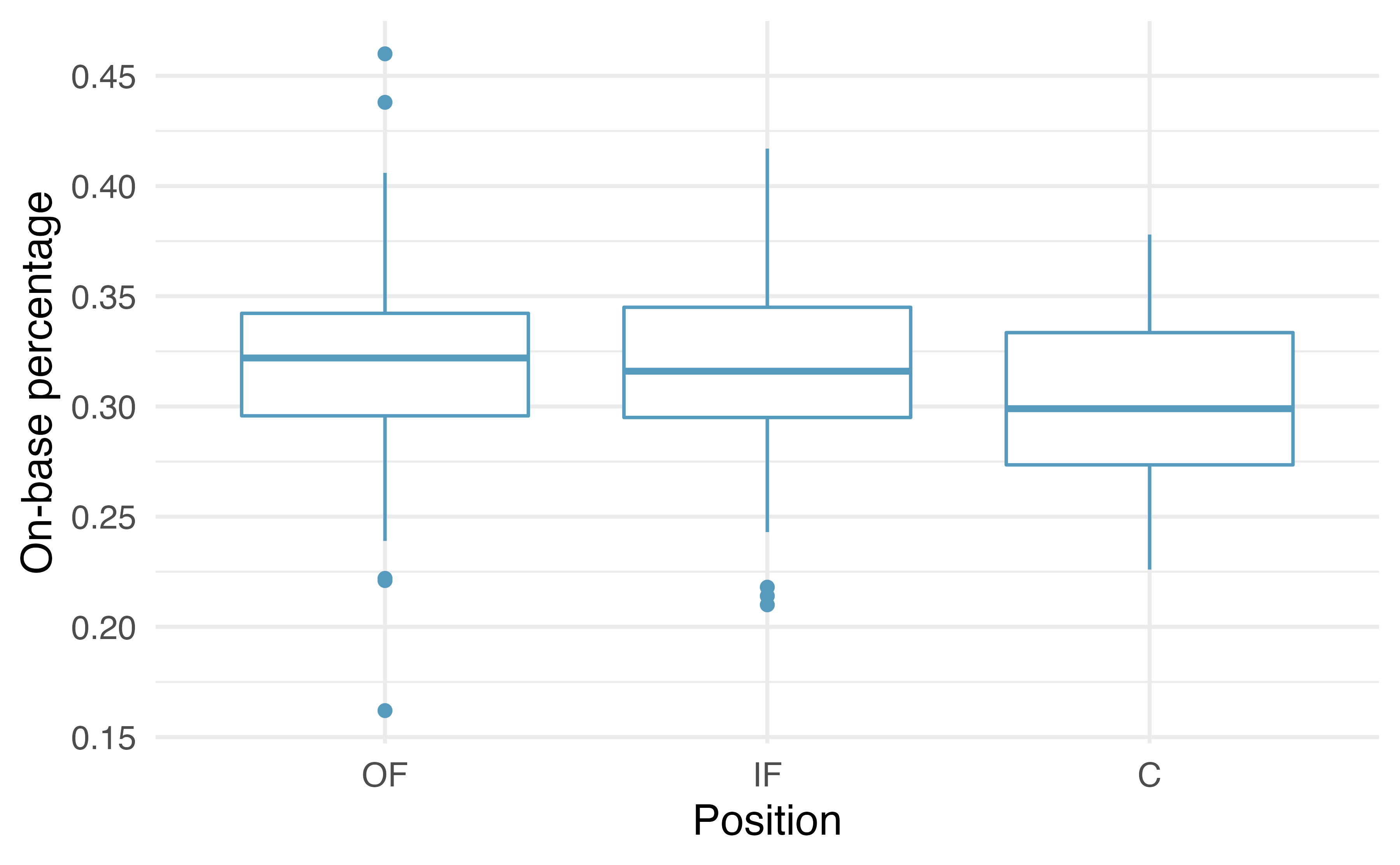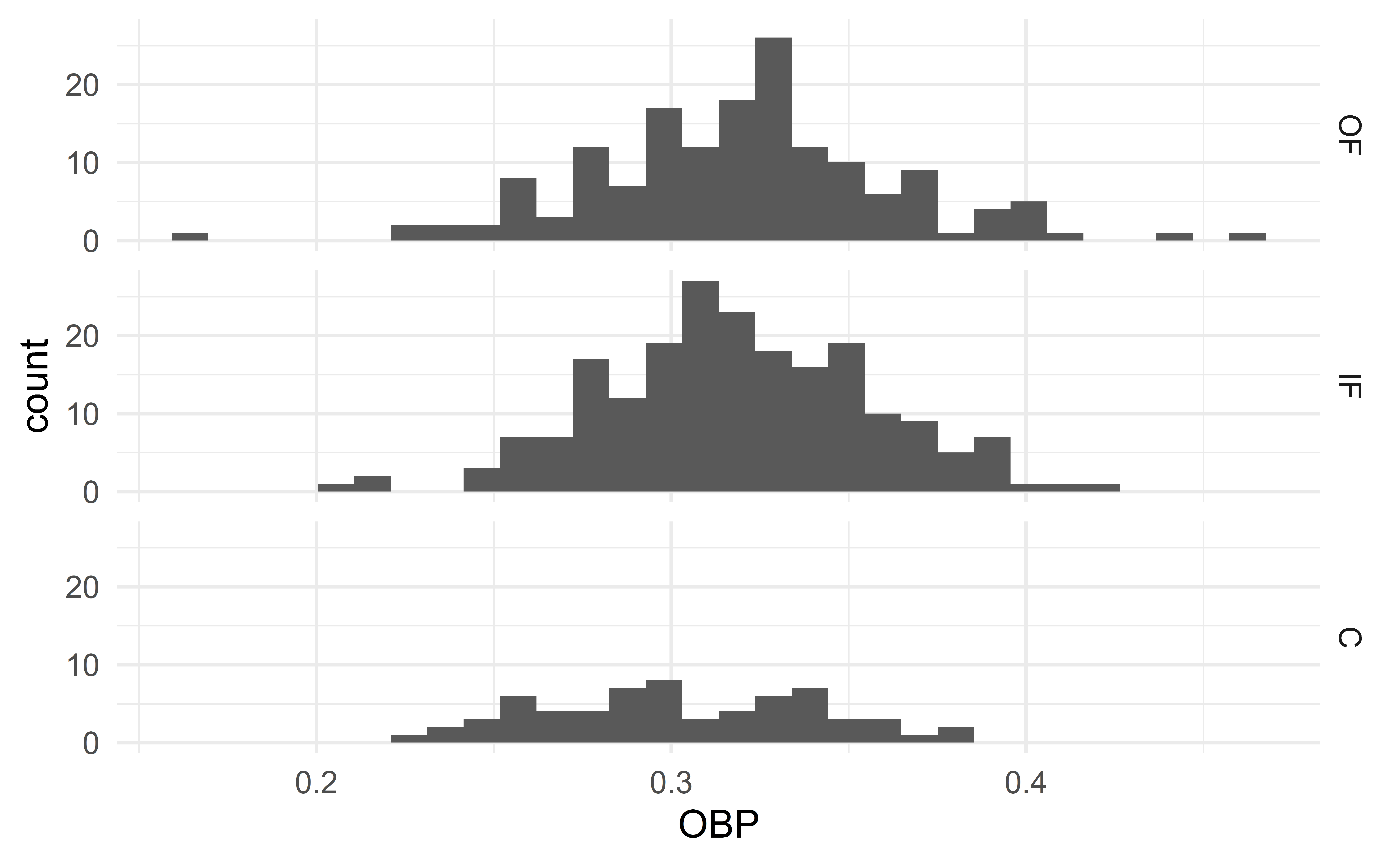 \(H_0: \mu_{OF} = \mu_{IF} = \mu_{C}\): (the batting performance is the same across all three positions)