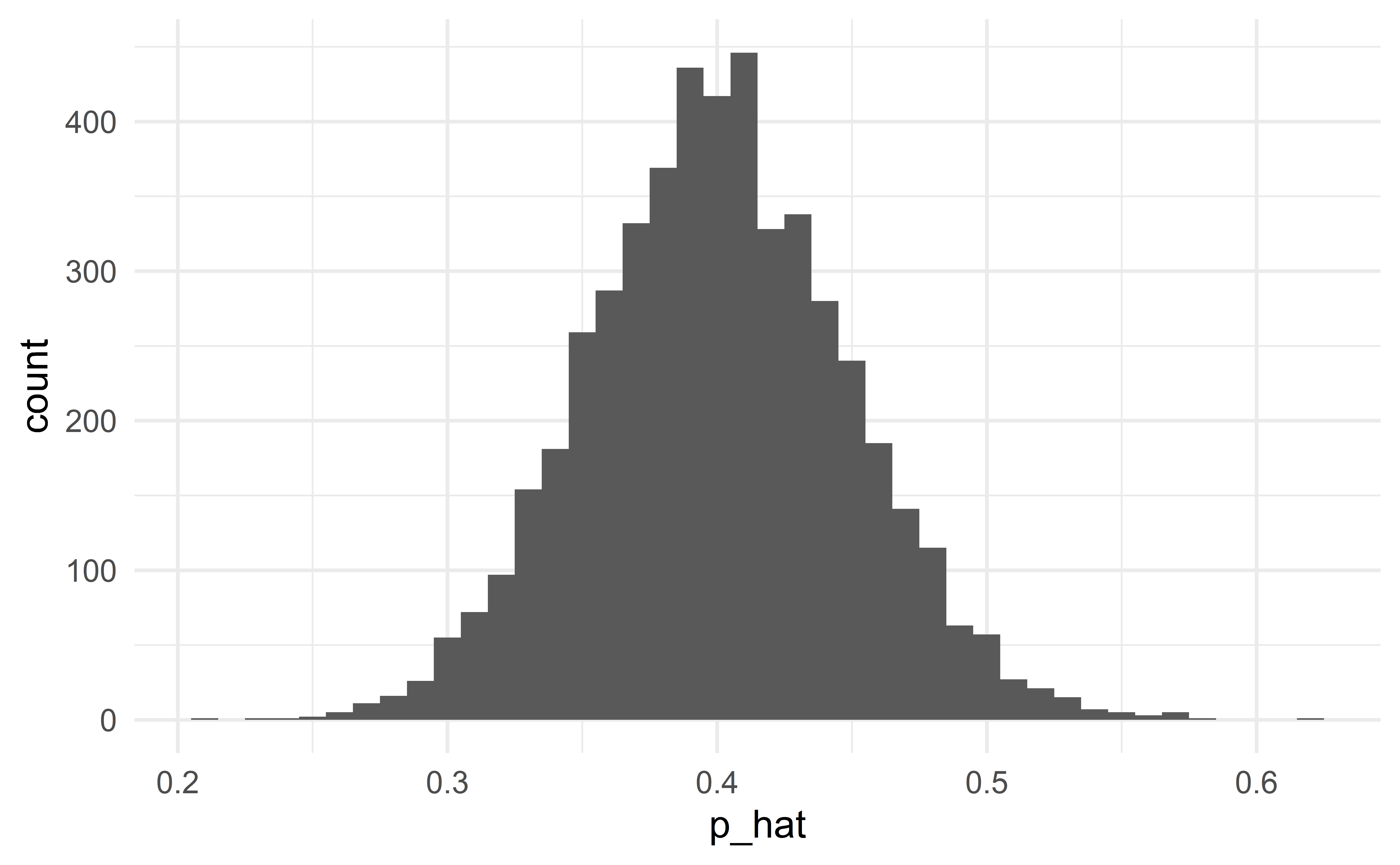 \(SE(\hat{p})=\sqrt{\frac{p(1-p)}{n}}\)