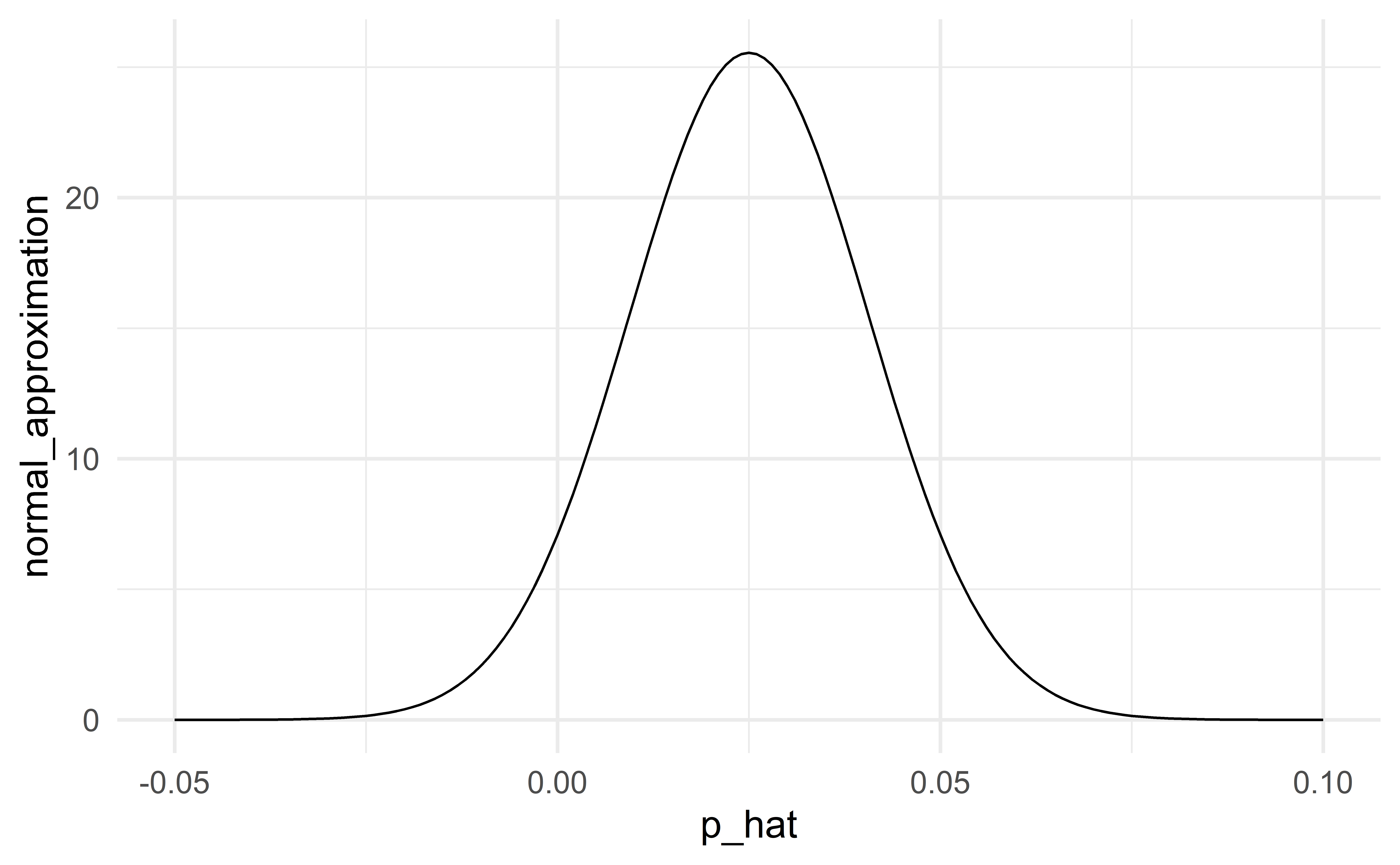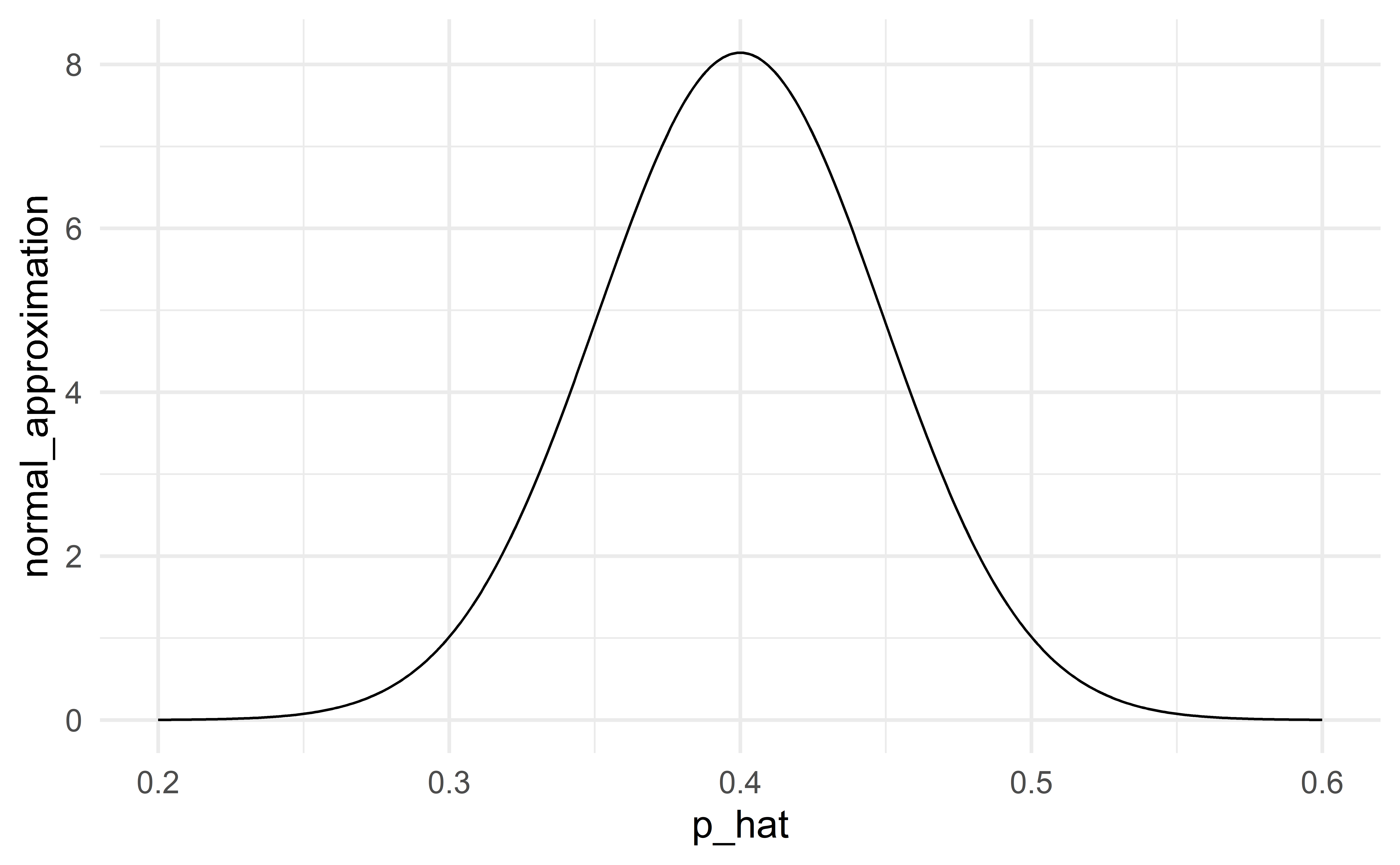 \[ \hat{p} \sim N\left(p, \frac{p(1-p)}{n}\right) \]
