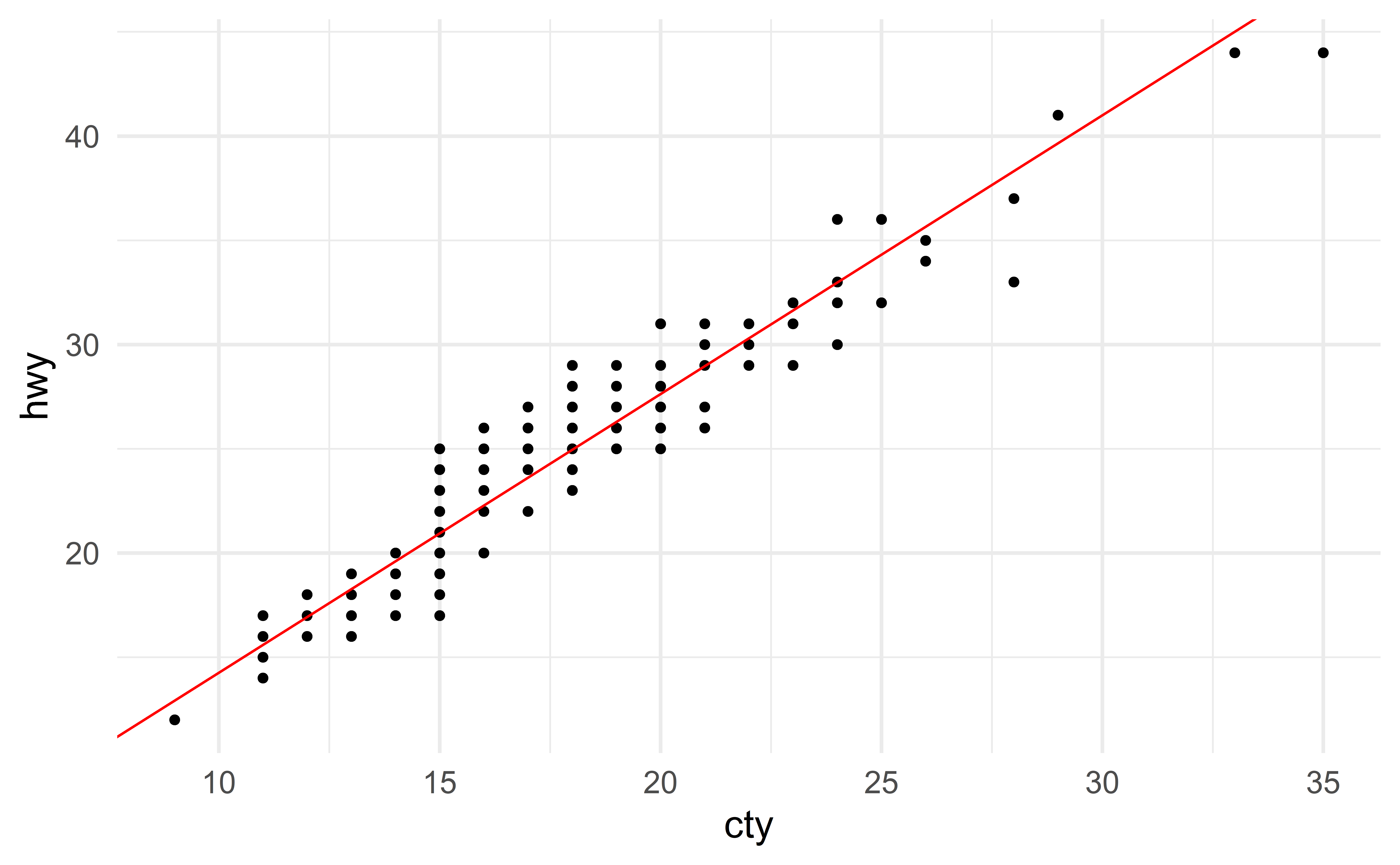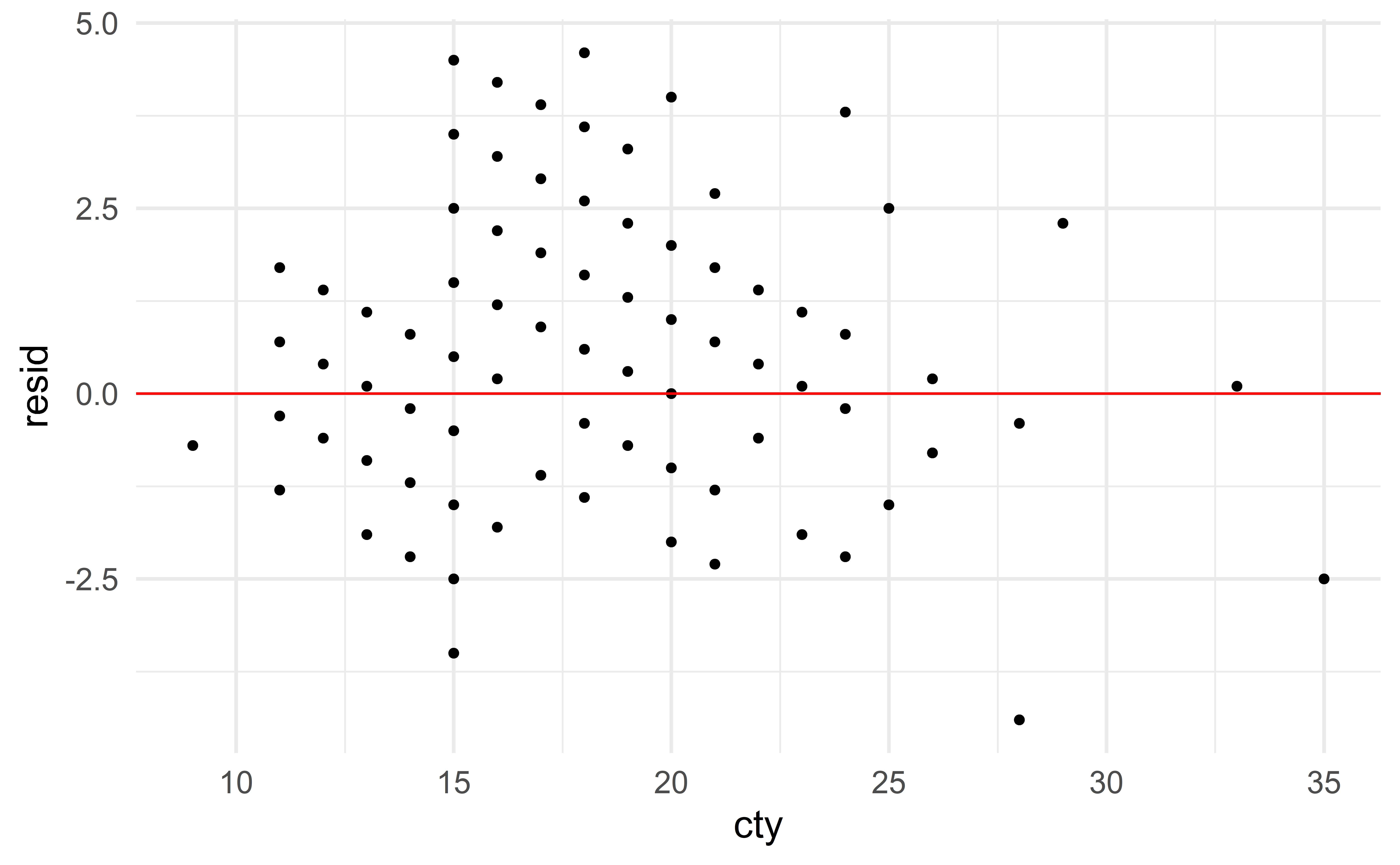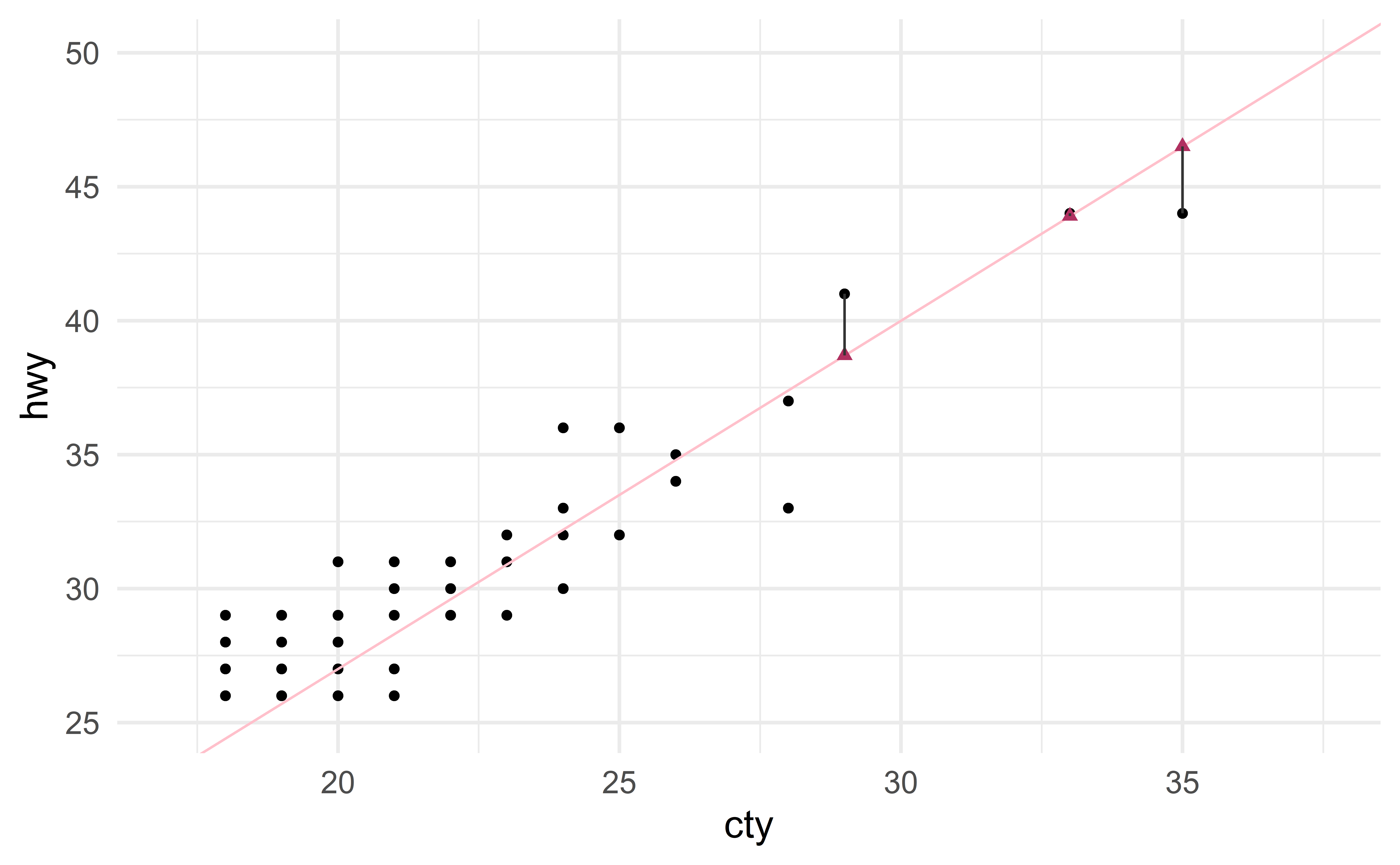 Imagine there is a new vehicle with \(\text{cty} = 30\). Instead of measuring its hwy (expensive), we use our model to estimate it. Using the “good” model gives the following estimate