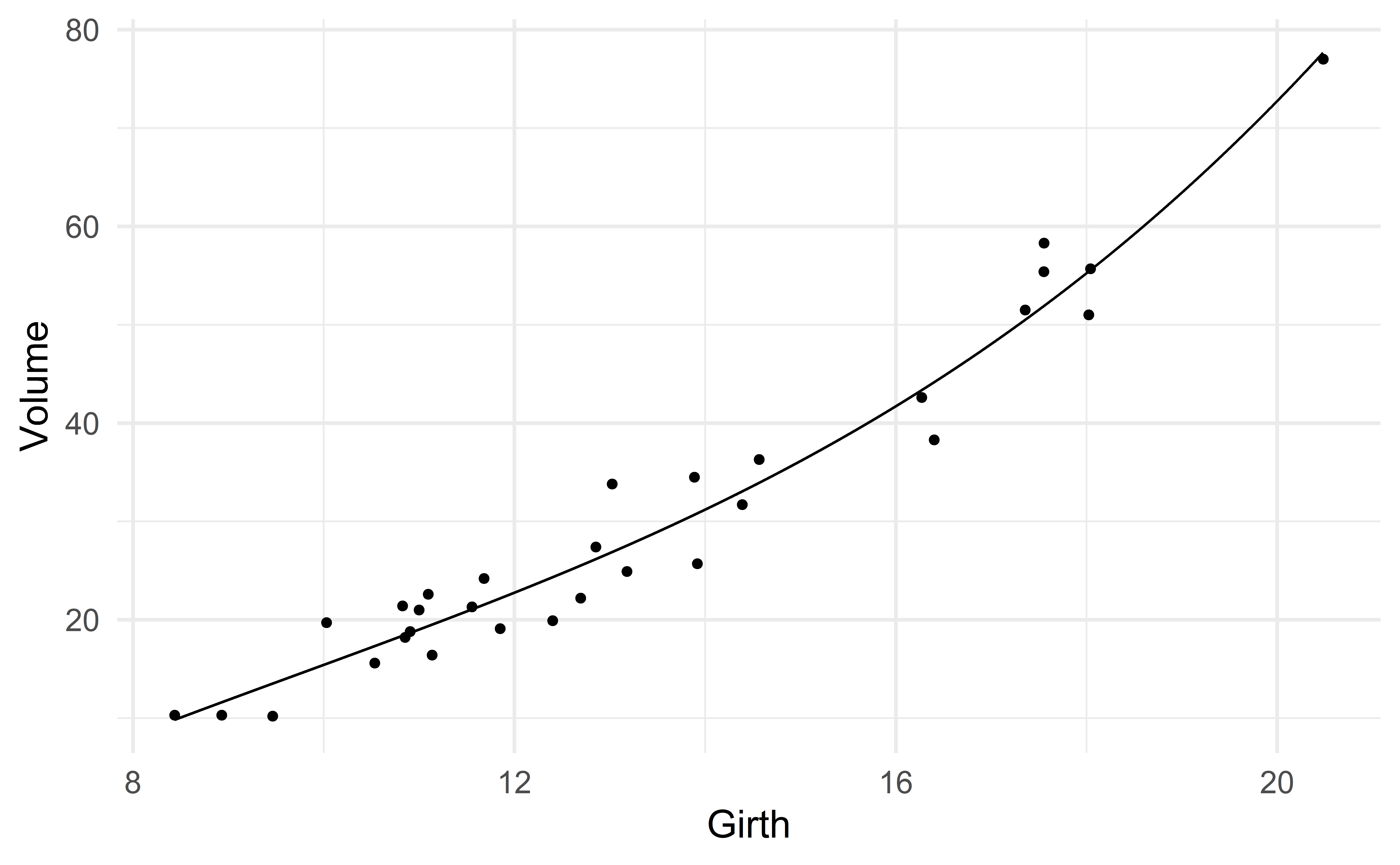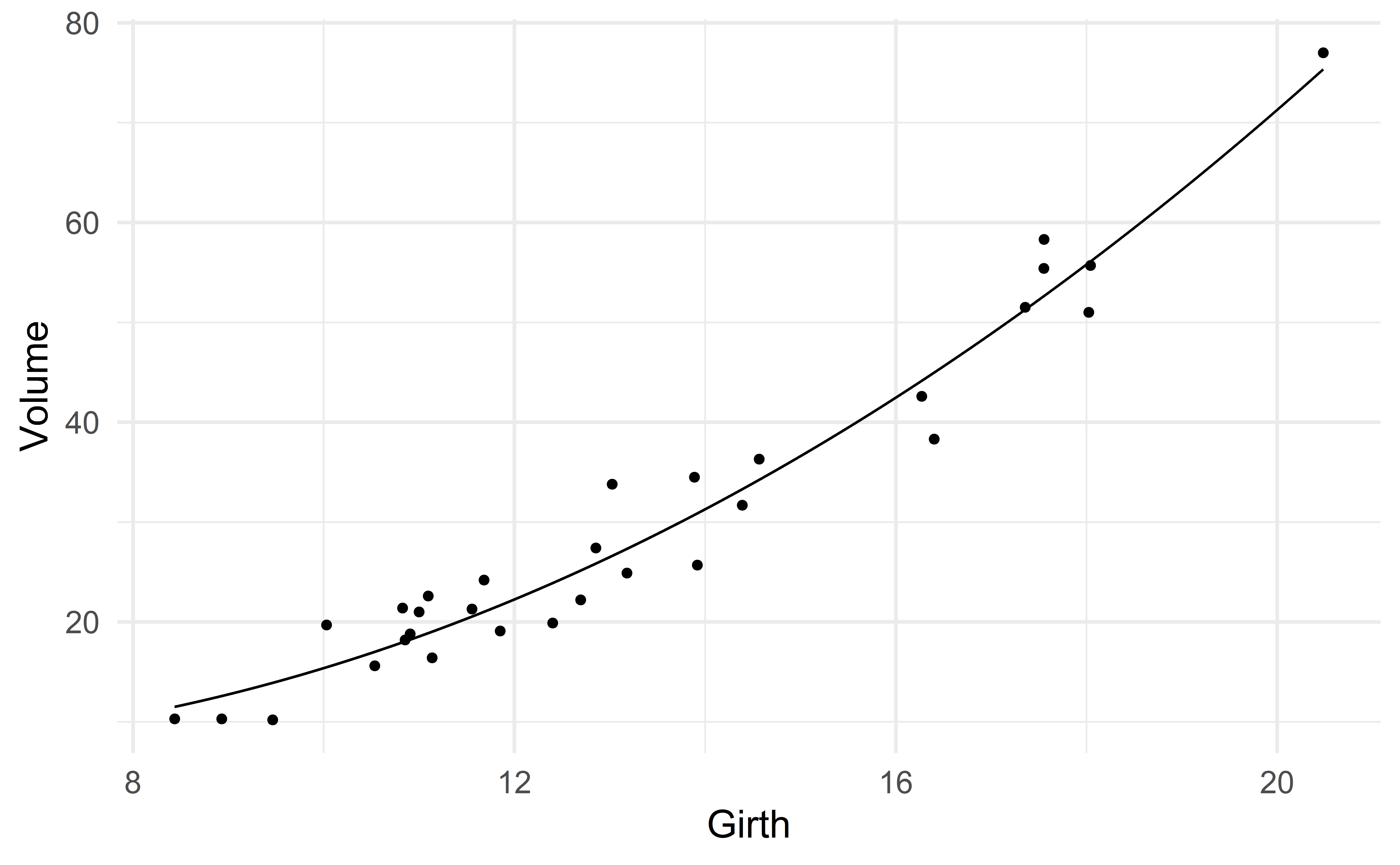 \[ \text{Volume} \approx \beta_0 + \beta_1 \text{girth} + \beta_2 \text{girth}^2 \]