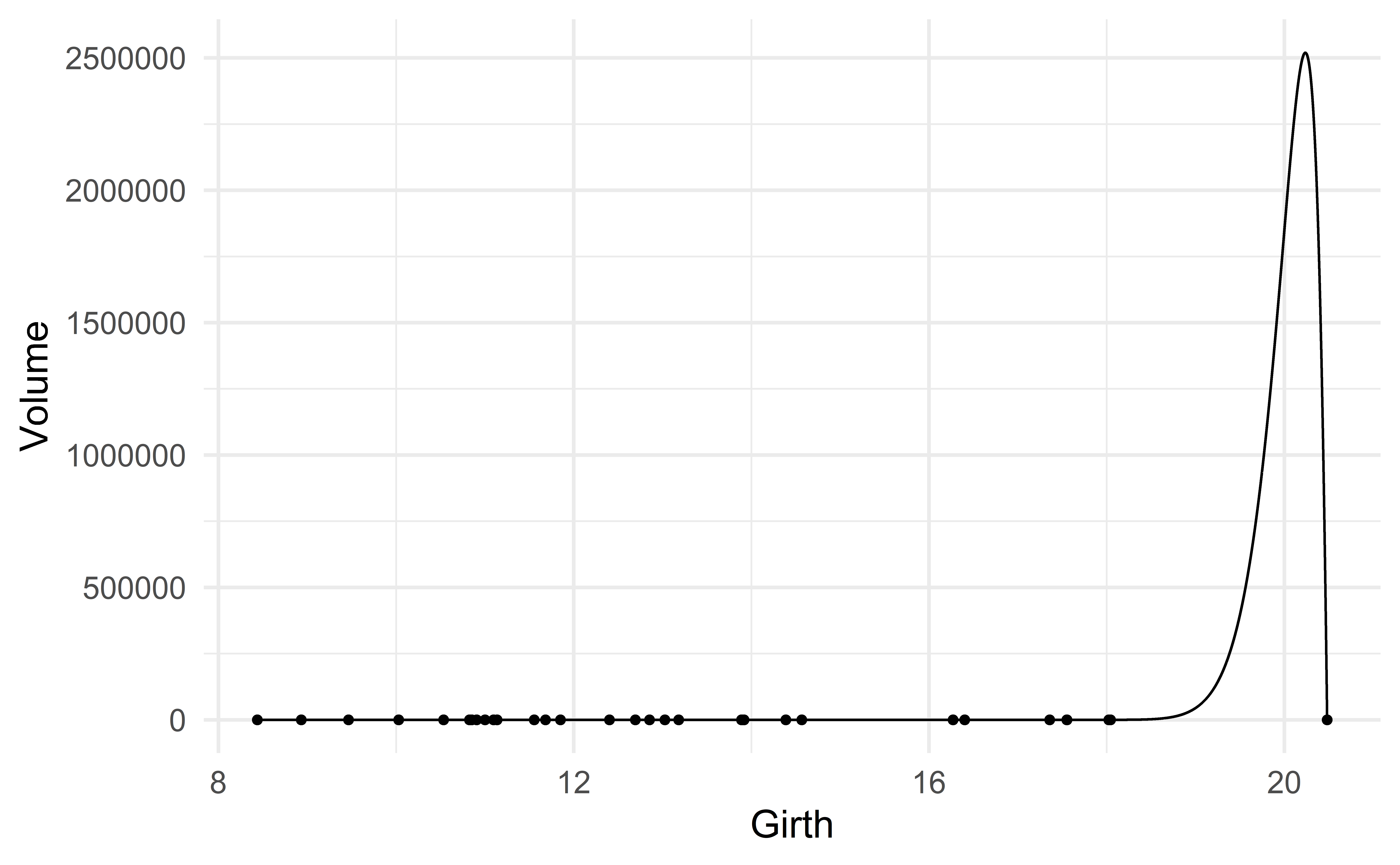 \[ \text{Volume} \approx \beta_0 + \beta_1 \text{girth} + \beta_2 \text{girth}^2 + \beta_3 \text{girth}^3 \]