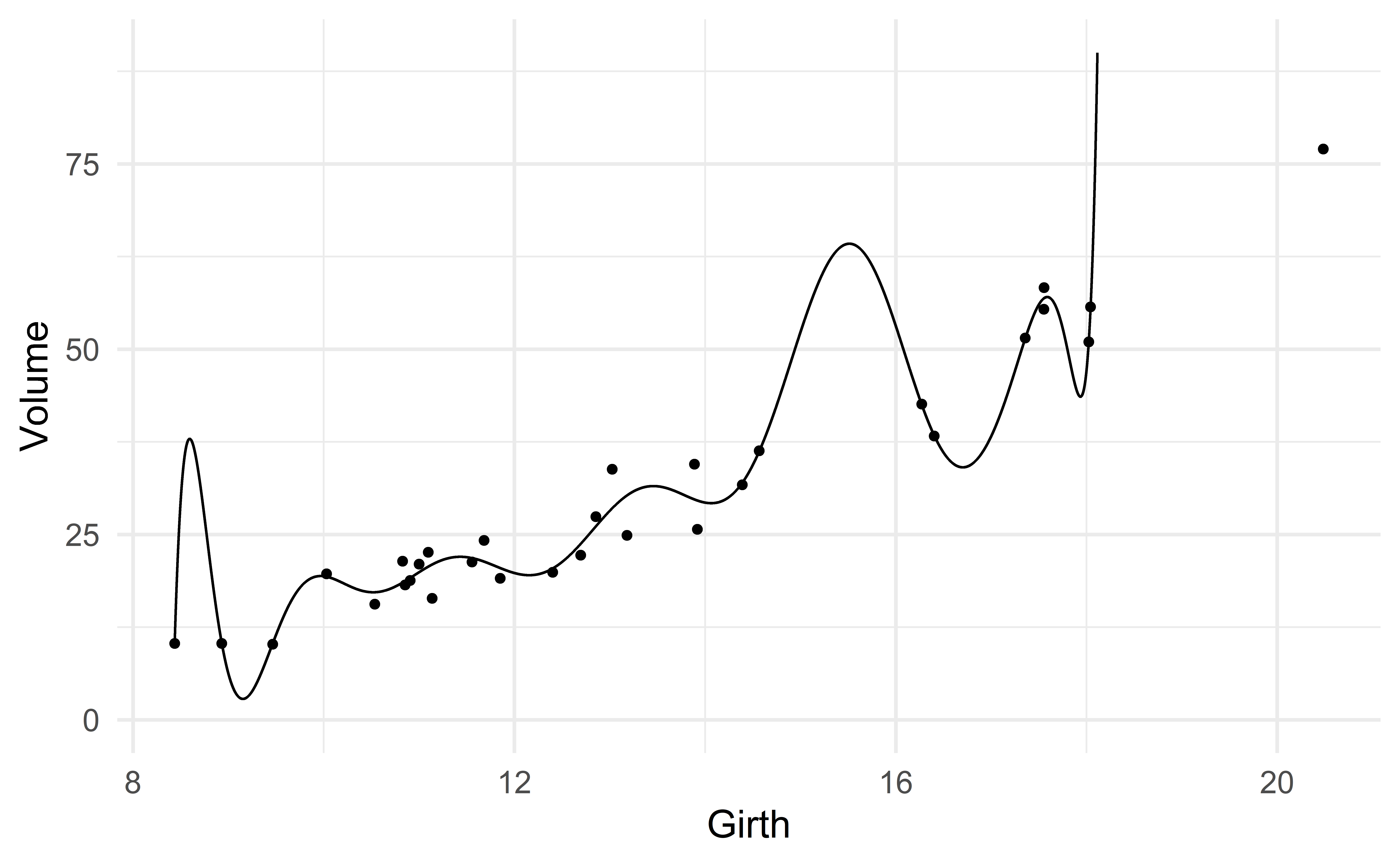 \[ \text{Volume} \approx \beta_0 + \beta_1 \text{girth} + \beta_2 \text{girth}^2 + \dots + \beta_{81} \text{girth}^{81} \]